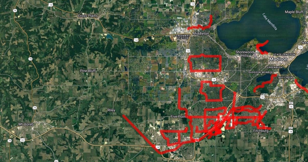 This is a map of the trails I have run in Madison, WI