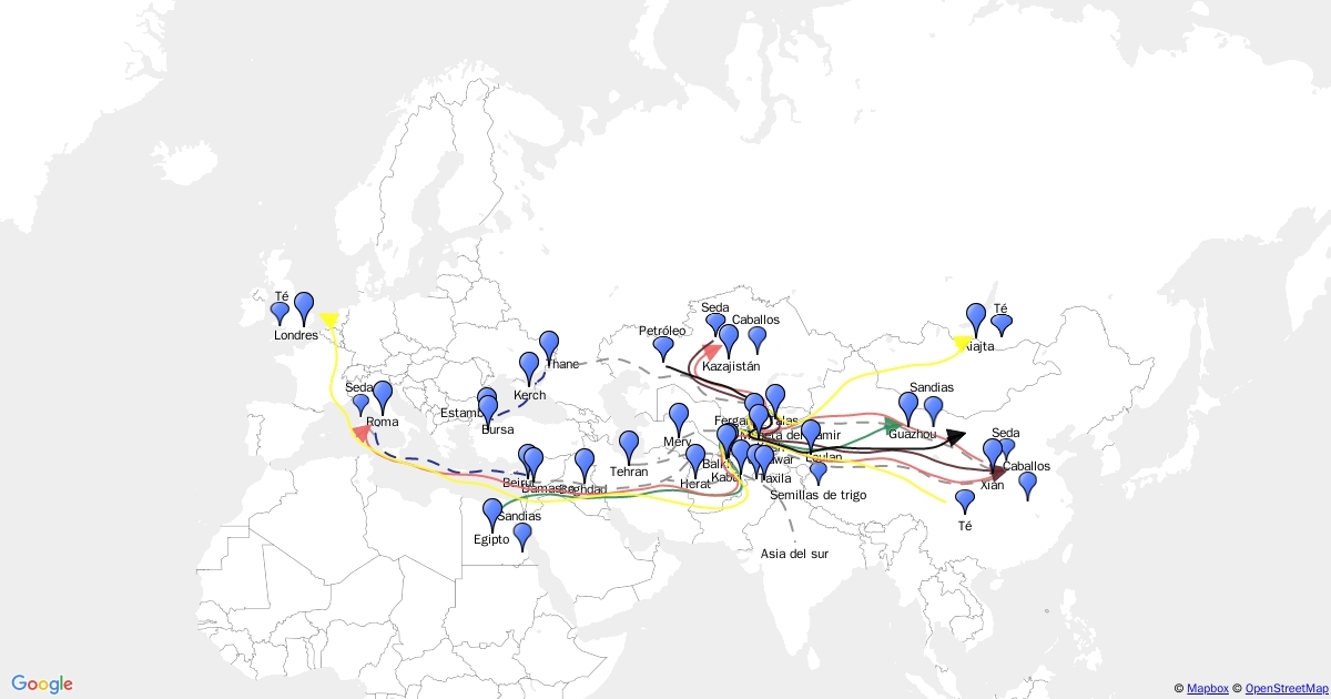Este mapa interactivo muestra, de manera resumida, los lugares más relevantes, las rutas y el flujo de las principales mercancías comercializadas en la gran ruta que conecta a Eurasia.