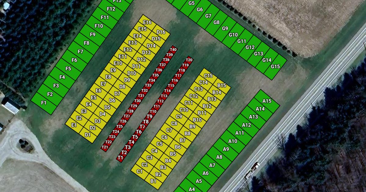Campground layout for the Longwoods Motorcycle Rally 2025 at Sloans Village.