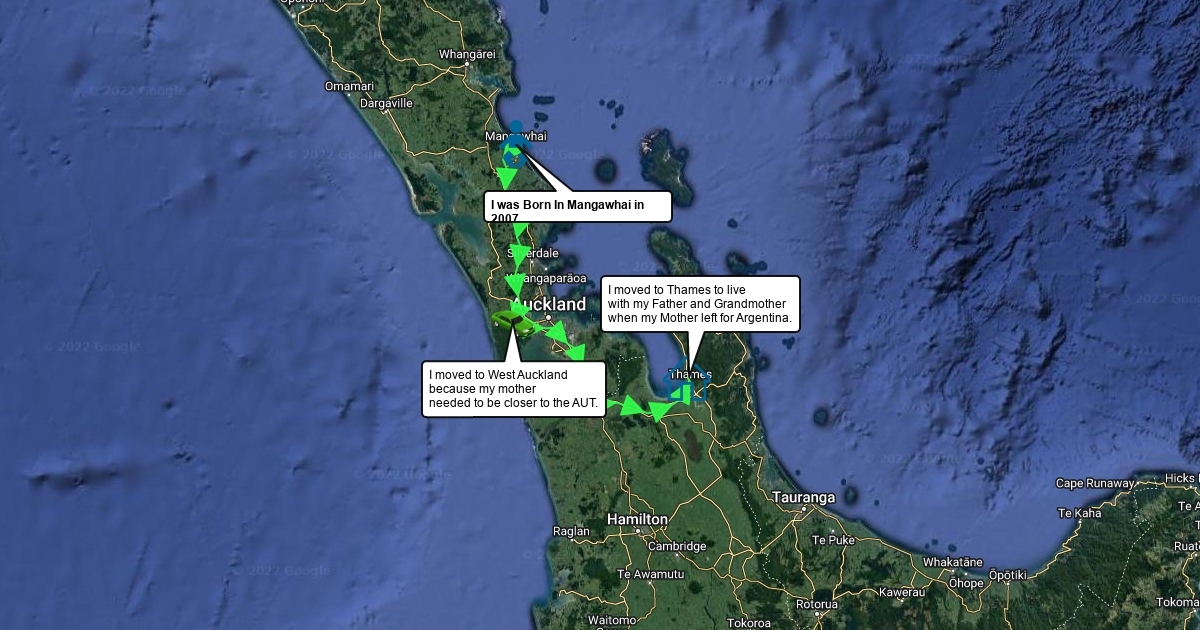 I moved from Mangawhai to West Auckland because my mother needed to be closer to the AUT. I moved from West Auckland to Thames to live with my father and grandmother when my mother left for Argentina. - Me.