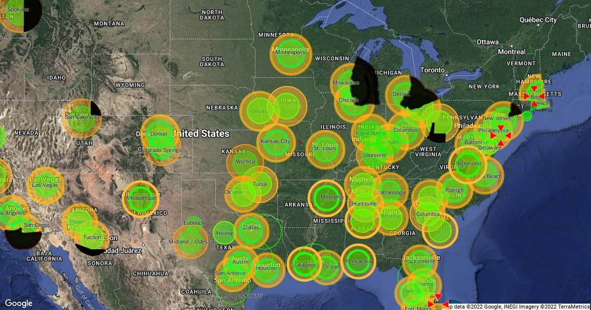 Shows the coverage radius for the nation.