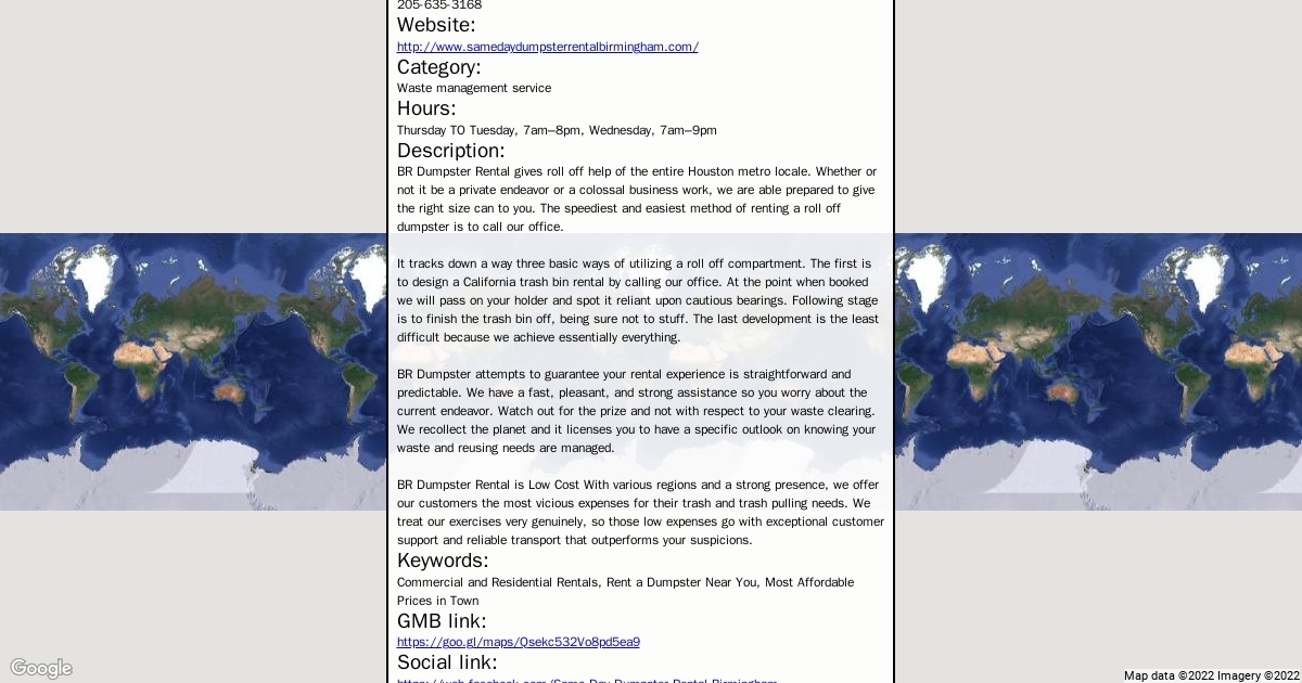 Address: 708 17th St N, Birmingham, AL 35203 Phone: 205-635-3168 Website: http://www.samedaydumpsterrentalbirmingham.com/ Category: Waste management service Hours: Thursday TO Tuesday, 7am–8pm, Wednesday, 7am–9pm