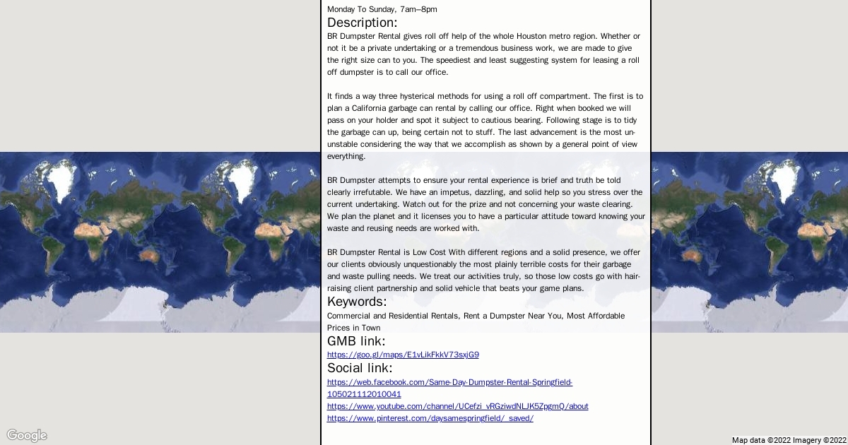 Address: 242 Cayenne St West Springfield, MA 01089 Phone: 413-422-6591 Website: http://samedaydumpsterrentalspringfield.com/ Category: Waste management service Hours: Monday To Sunday, 7am–8pm