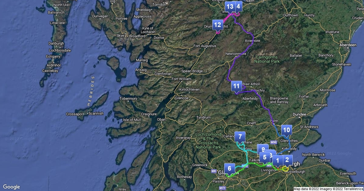 A roadtrip from Edinburg to Inverness, passing through all important film sites from the outlander tvseries. Every new color is a different day