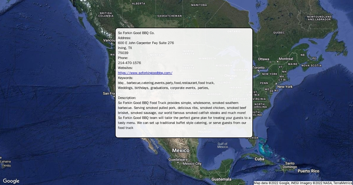 So Forkin Good BBQ Food Truck provides simple, wholesome, smoked southern barbecue. Serving smoked pulled pork, delicious ribs, smoked chicken, smoked beef brisket, smoked sausage, our world famous smoked catfish steaks and much more!