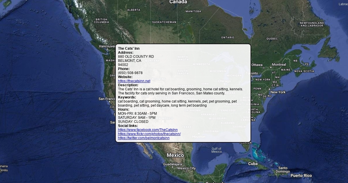 Address: 880 OLD COUNTY RD BELMONT, CA 94002 Phone: (650) 508-9878 Website: https://thecatsinn.net Description: The Cats' Inn is a cat hotel for cat boarding, grooming, home cat sitting, kennels. The facility for cats only serving in San Francisco, San Mateo county. Keywords: cat boarding, cat grooming, home cat sitting, kennels, pet, pet grooming, pet boarding, pet sitting, pet daycare, long term pet boarding Hours: MON-FRI: 8:30AM - 5PM SATURDAY: 9AM - 1PM SUNDAY: CLOSED Social links: https://www.facebook.com/TheCatsInn https://www.flickr.com/photos/thecatsinn/ https://twitter.com/belmontcatsinn