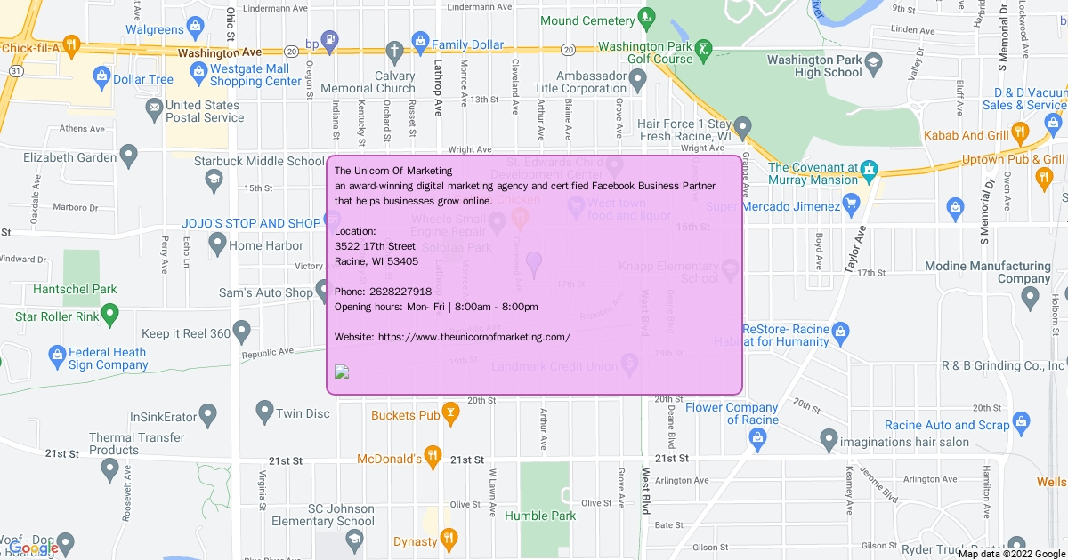 At The Unicorn of Marketing, we have a slew of unicorn marketing skills for you to choose from. Our team is ready with solutions before your campaign launches or after it ends with techniques in blogging and email campaigns as well as organic traffic and social reach plans. We provide Web Design, Social Media Management, SEO (Search Engine Optimization), Facebook & Instagram advertising, email marketing campaigns, and more. Location: 3522 17th Street Racine, WI 53405 Phone: 2628227918 Opening hours: Mon- Fri | 8:00am - 8:00pm Website: https://www.theunicornofmarketing.com/