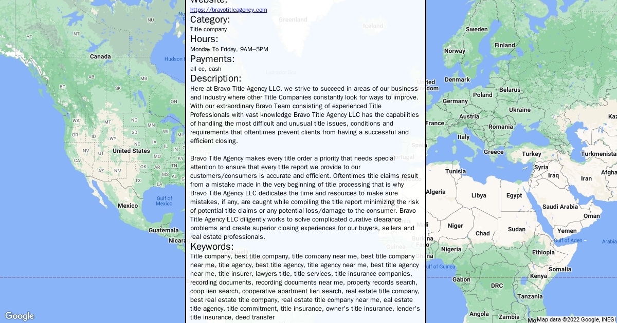 Address: 9-89 Wyckoff Ave, Queens, NY 11385 Phone: (347) 560-5838 Website: https://bravotitleagency.com Category: Title company Hours: Monday To Friday, 9AM–5PM Payments: all cc, cash