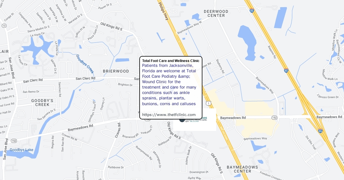 Patients from Jacksonville, Florida are welcome at Total Foot Care Podiatry & Wound Clinic for the treatment and care for many conditions such as ankle sprains, plantar warts, bunions, corns and calluses