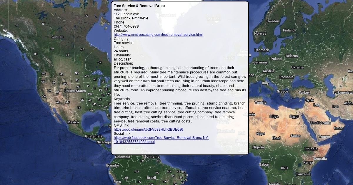 Address: 112 Lincoln Ave The Bronx, NY 10454 Phone: (347) 704-5978 Website: http://www.mmtreecutting.com/tree-removal-service.html Category: Tree service Hours: 24 hours Payments: all cc, cash