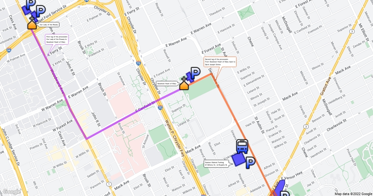 Parking and procession route for the Unite Detroit Eucharistic procession. https://uniteournation.net/event/detroit-michigan/