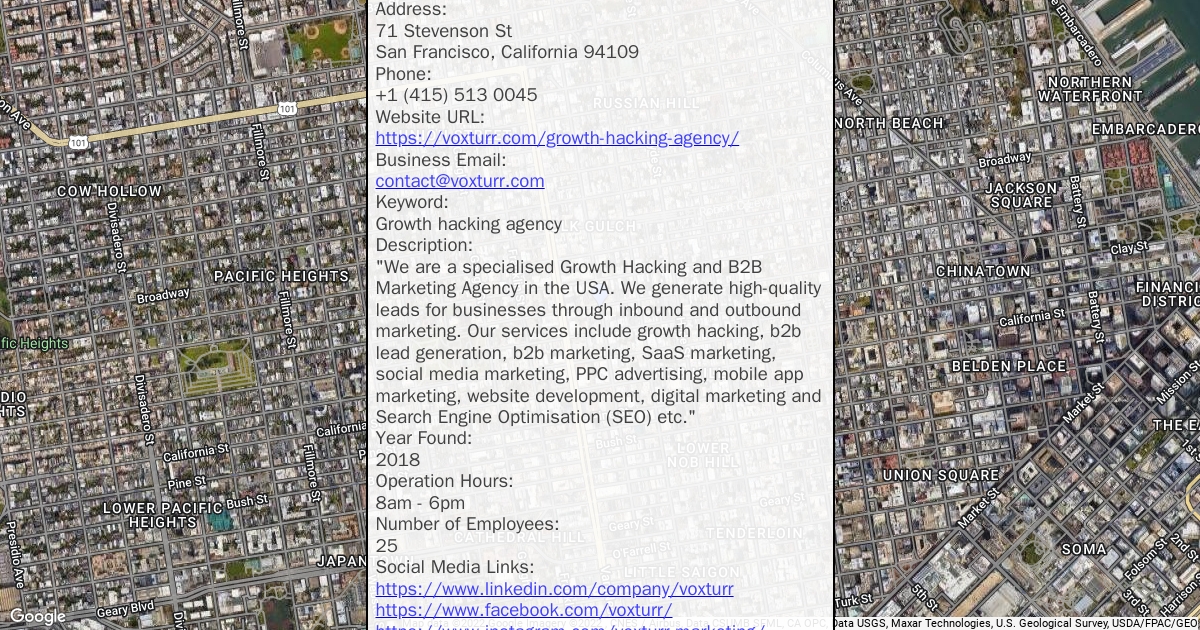 Business owner name: Gaurav Lakhani Address: 71 Stevenson St San Francisco, California 94109 Phone: +1 (415) 513 0045 Website URL: https://voxturr.com/growth-hacking-agency/ Business Email: contact@voxturr.com