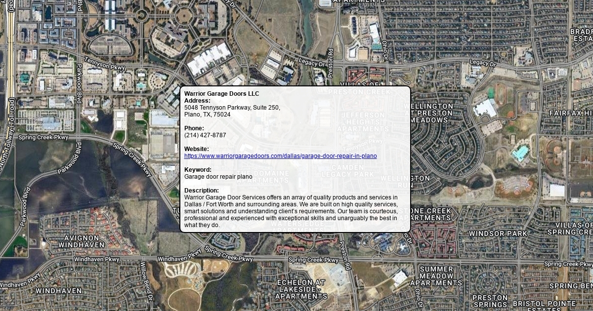 Address: 5048 Tennyson Parkway, Suite 250, Plano, TX, 75024 Phone: (214) 427-8787 Website: https://www.warriorgaragedoors.com/dallas/garage-door-repair-in-plano Keyword: Garage door repair plano Description: Warrior Garage Door Services offers an array of quality products and services in Dallas / Fort Worth and surrounding areas. We are built on high quality services, smart solutions and understanding client’s requirements. Our team is courteous, professional and experienced with exceptional skills and unarguably the best in what they do.