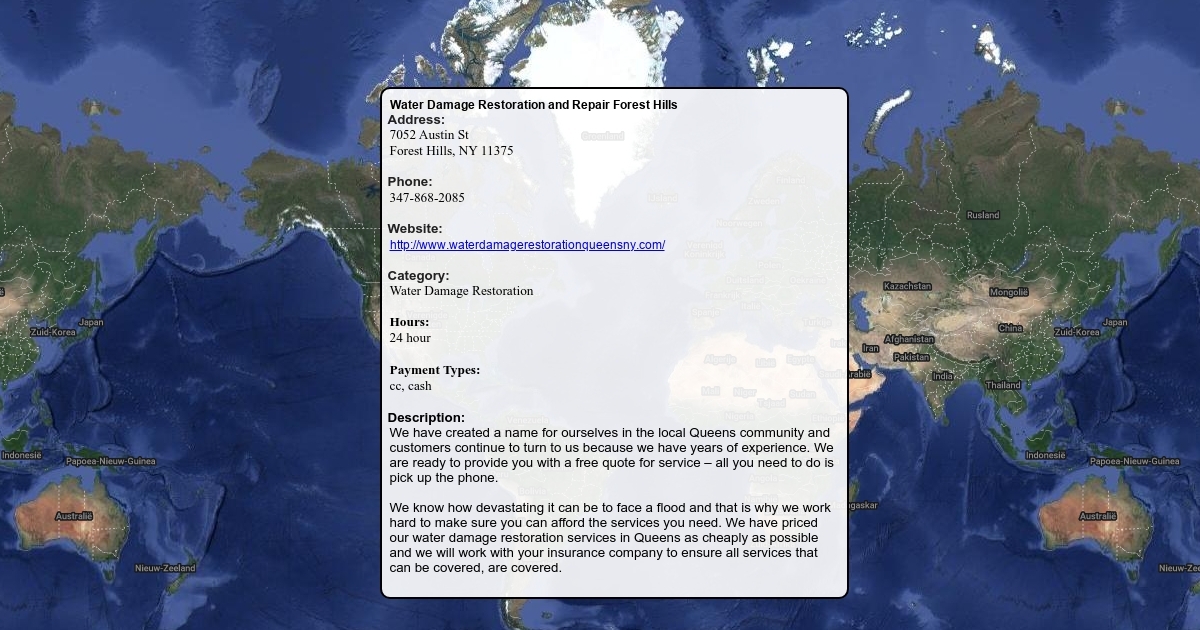 We have created a name for ourselves in the local Queens community and customers continue to turn to us because we have years of experience. We are ready to provide you with a free quote for service – all you need to do is pick up the phone. We know how devastating it can be to face a flood and that is why we work hard to make sure you can afford the services you need. We have priced our water damage restoration services in Queens as cheaply as possible and we will work with your insurance company to ensure all services that can be covered, are covered. Affordable Water Damage Restoration and Repair Forest Hills – Queens. Some of the services we offer include: Structural drying, Mold remediation, Flood damage cleanup, Water damage repairs, Water damage inspections and evaluations, And more.