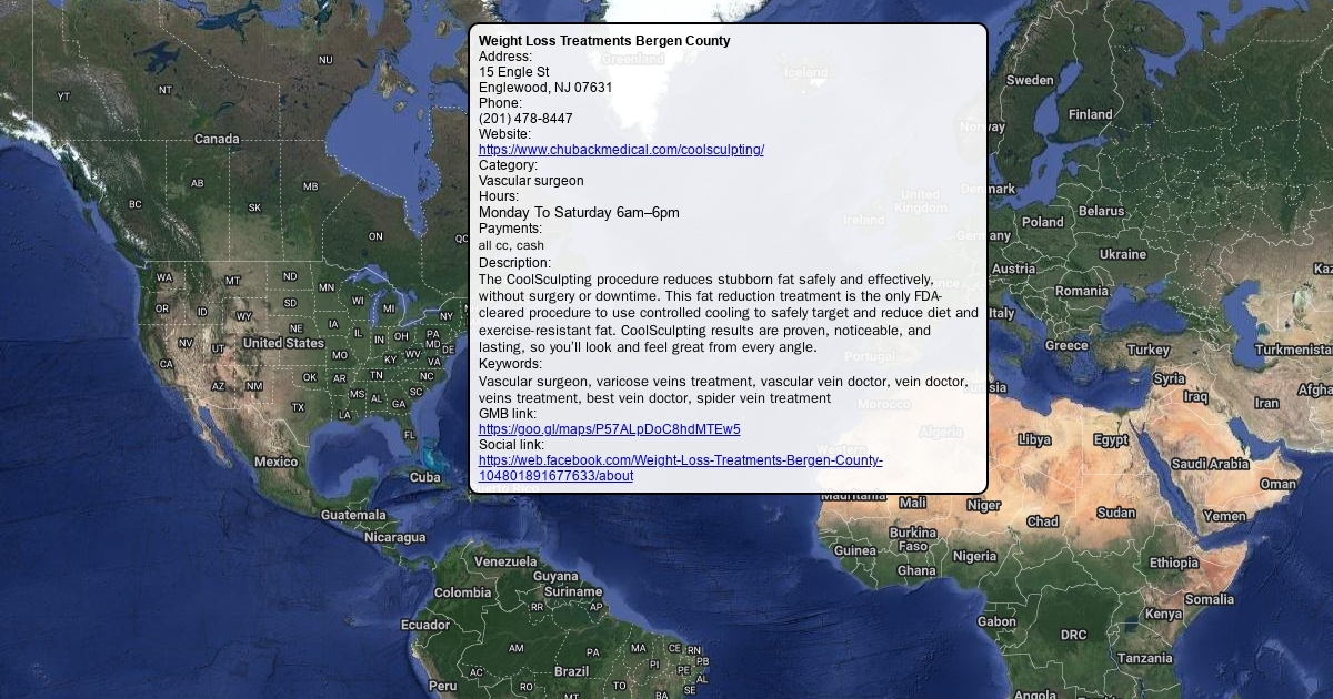 Address: 15 Engle St Englewood, NJ 07631 Phone: (201) 478-8447 Website: https://www.chubackmedical.com/coolsculpting/ Category: Vascular surgeon Hours: Monday To Saturday 6am–6pm Payments: all cc, cash