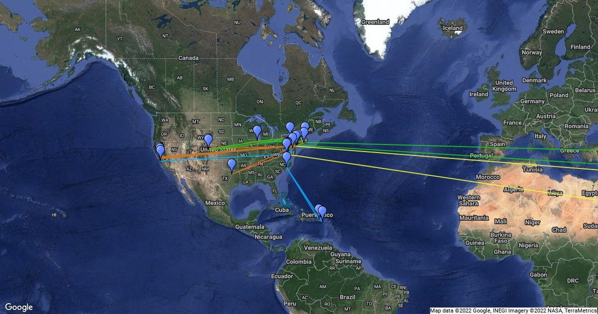 This is a map following the migration of Heather (Blue), Creighton (partially, yellow), Paget (Orange), and Wiley (Green)