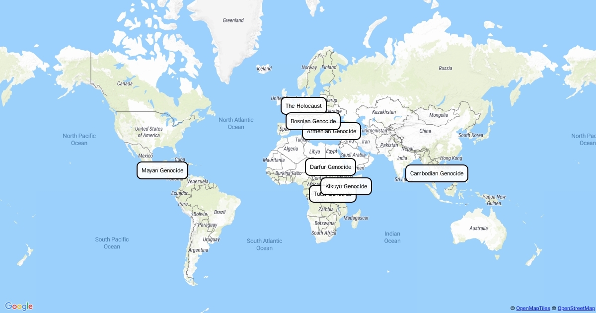 World map locations of the genocides mentioned in Worse Than War.