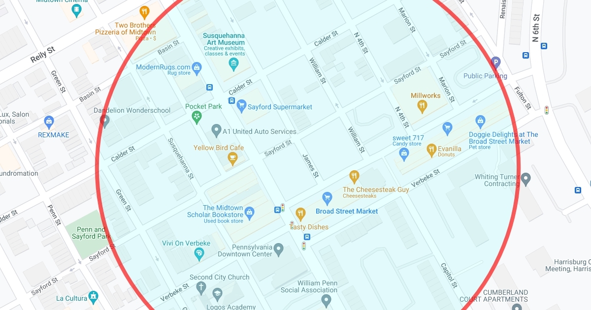 area around site on verbeke st, harrisburg, pa, with .25 diameter circle around