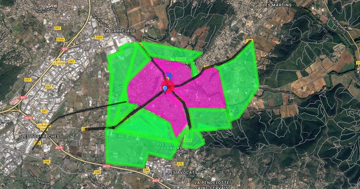 environnement La Crau j'ai tracé en noir la route D554 et D29, et en noir fin la voie ferrée. En vert les champs, en rose la ville peuplée et en cercle rouge le centre ville.