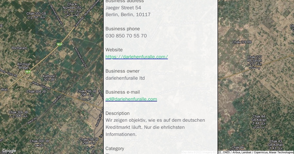 Business address Jaeger Street 54 Berlin, Berlin, 10117 Business phone 030 850 70 55 70 Website https://darlehenfuralle.com/